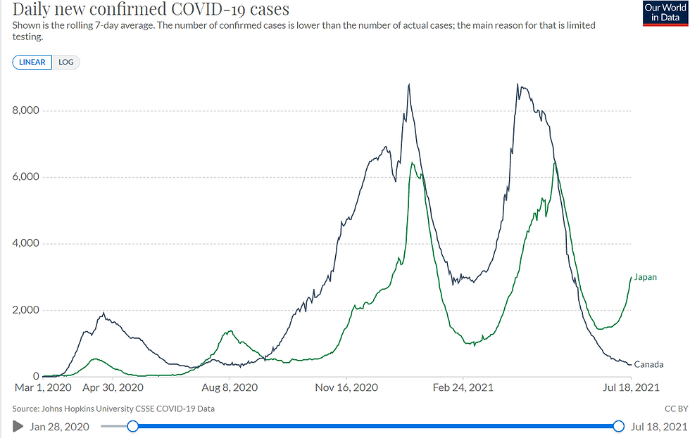 While Japan's four waves have been minimal compared to Canada's three, their fifth wave is now ramping up.