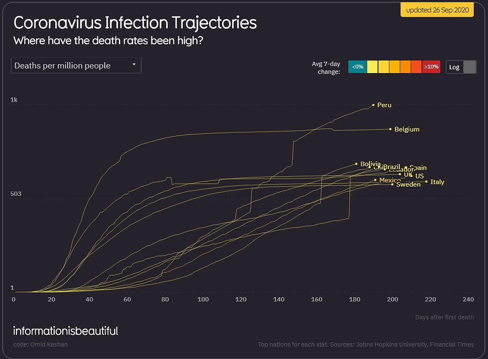 From a case fatality perspective the america's continue to dominate the Top-20. With eleven countries (Peru, Bolivia, Chile, Ecuador, Brazil, USA, Mexico, Colombia, Argentina, Canada and Honduras) and several more not far behind. Most of the rest are in Europe (Belgium, Spain, UK, Italy, Sweden, France and the Netherlands):